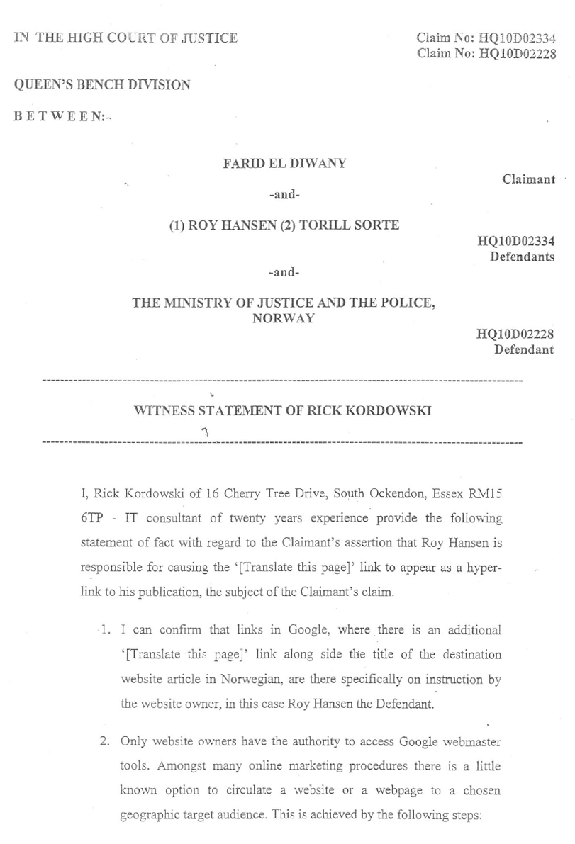 As for your falsehood in your 'Comments' section on our court case that Google were responsible for the translation into English see the Affidavit (attached together with letter to Roy Hansen) put in to the Court of Appeal by my I.T expert Rick Kordowski. It was "fresh evidence" said Sir Richard Buxton for which permission to submit should have been seperately made. It was Roy Hansen himself who deliberately set up the 'Translate this page' link as so ably confirmed by Kordowski. Hansen later took the article down from his website. He knows full well that Torill Sorte is an abject liar. But the matter is not over yet with Sorte, I can promise you. She has no place in any Police Force.