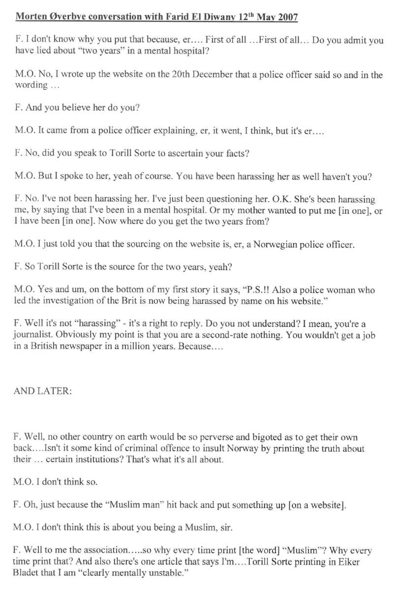 6. Your client Torill Sorte was the catalyst for those vile emails read out in court in 2011. The emails came on the same consecutive days that the 2005 Dagbladet articles on my two years 'incarceration' was published. The senders of two or three of the emails indicated that they believed Torill Sorte's claim that my mother had me sectioned for two years. Does David Hirst still refuse to condemn the emails that the British police declared a hate crime and sent to Interpol?